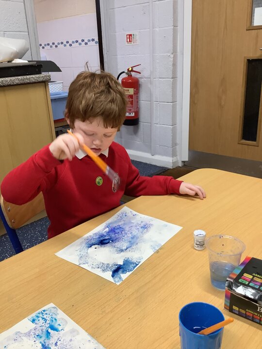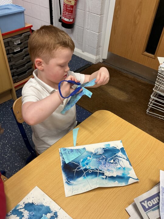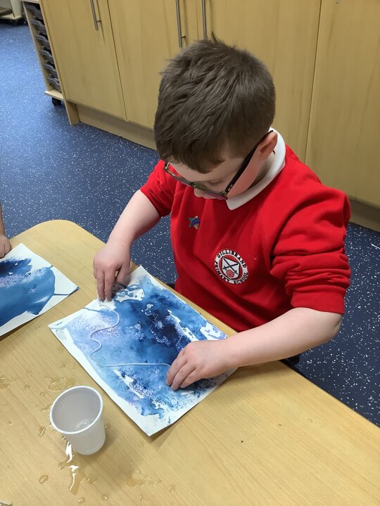 In art, the pupils experimented with a new collage technique to create their backgrounds. They practised careful brush control, using gentle strokes with water to form wave-like patterns that mimicked the cold Antarctic sea. Powder paint in different shades of blue was then added and shaken across the page to create a beautiful marbled effect. To add depth and movement, the children flicked water onto their paintings, creating a sense of dimension.