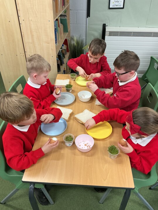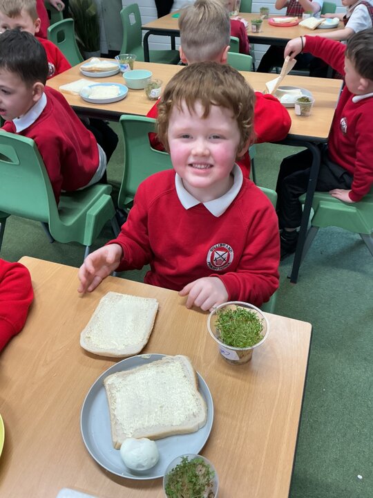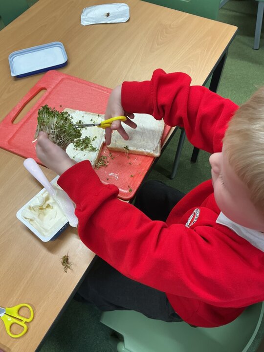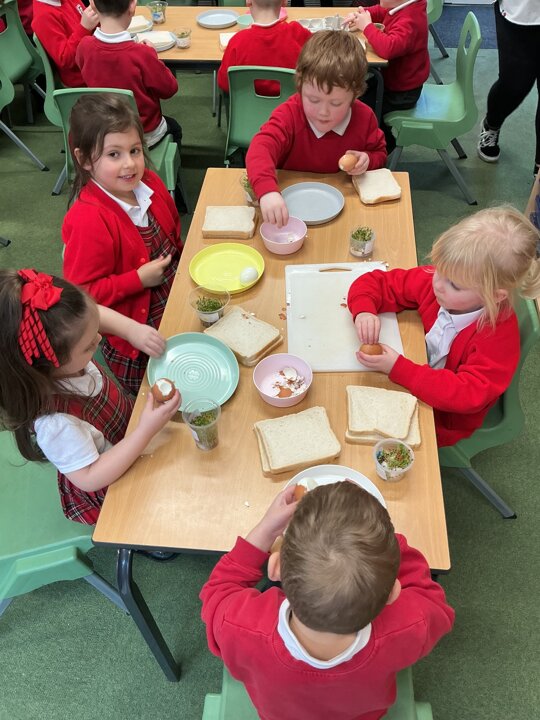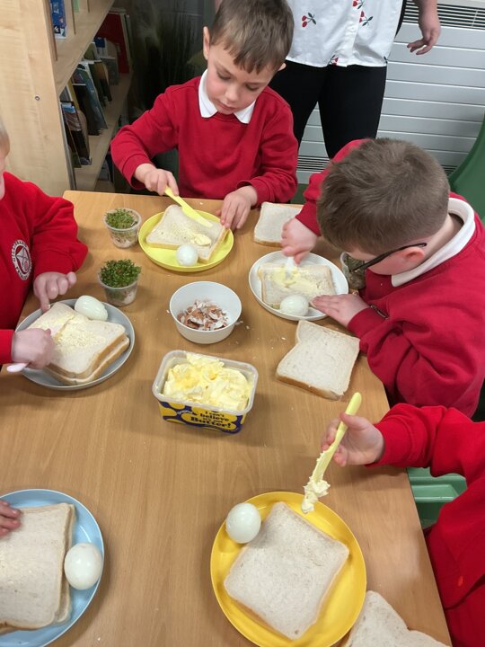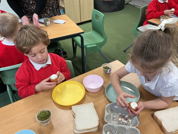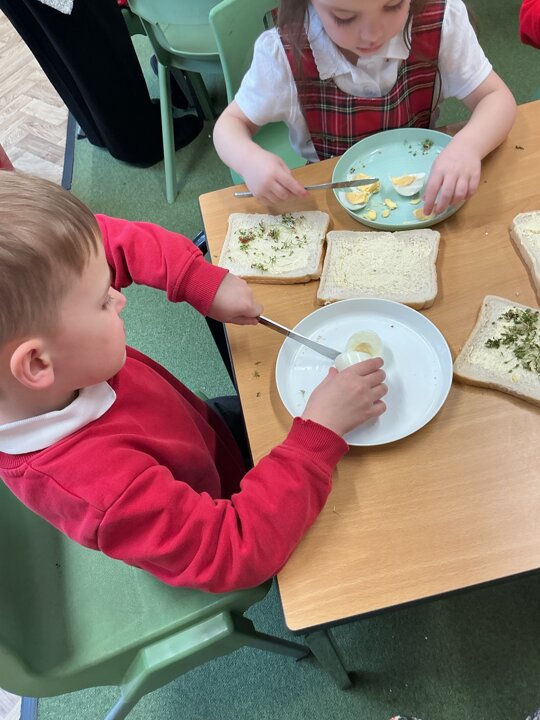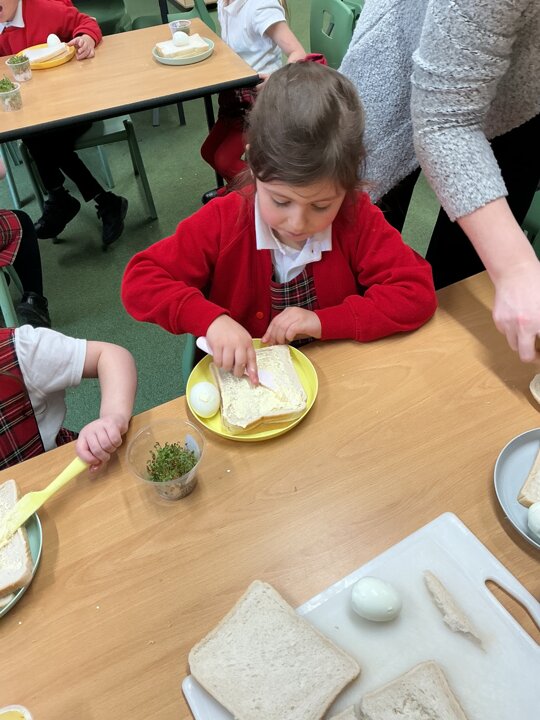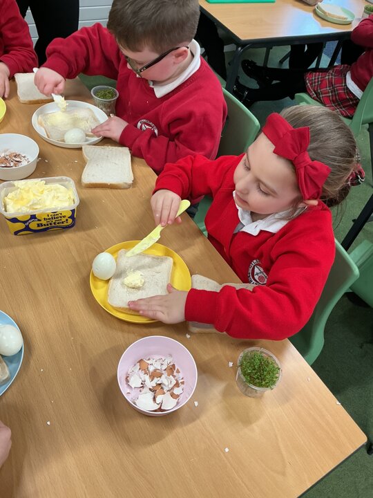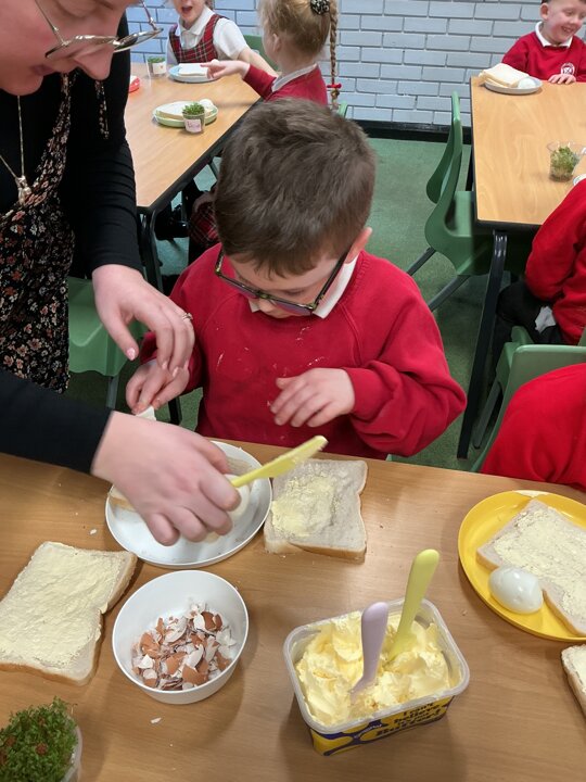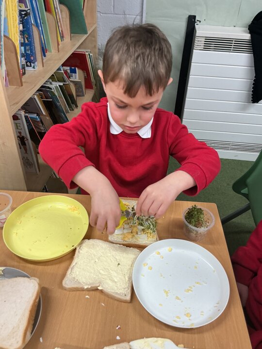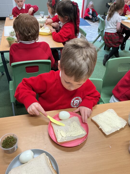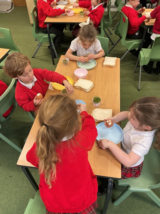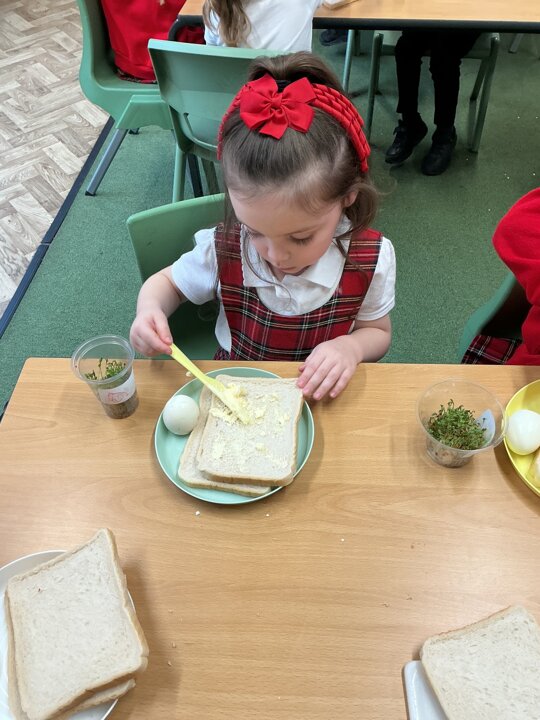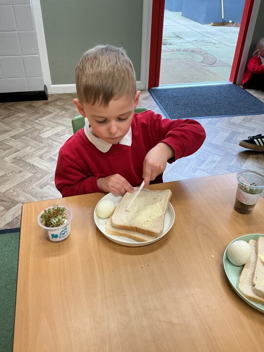 Reception class have been developing their fine motor skills through a fun and practical cooking activity. The children made their own egg and cress sandwiches using cress they had grown themselves in class.