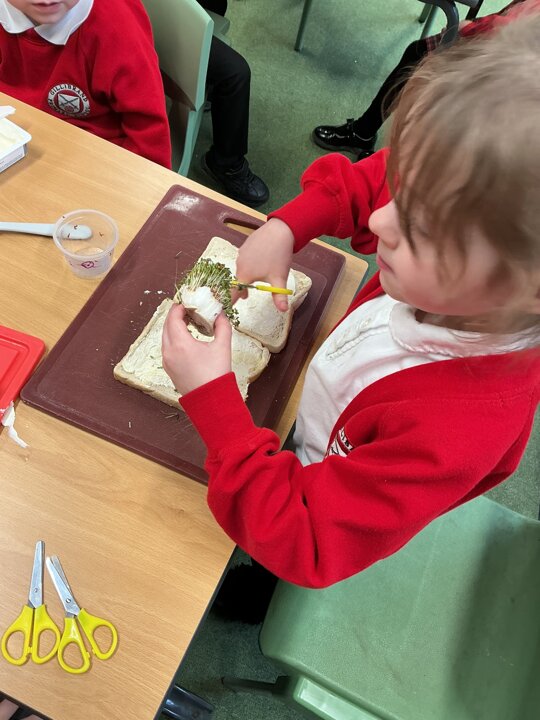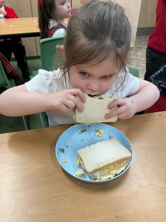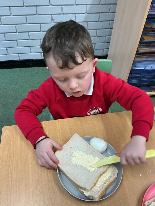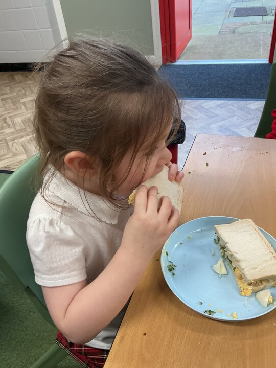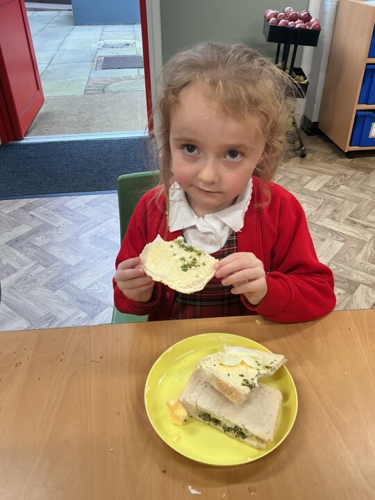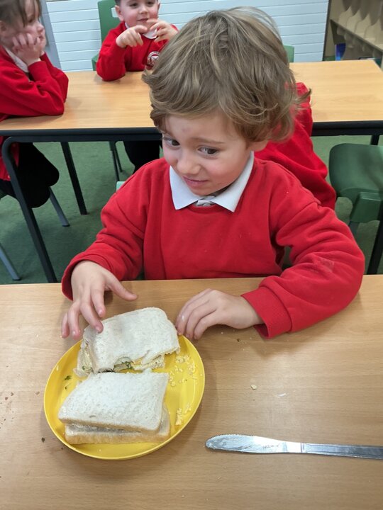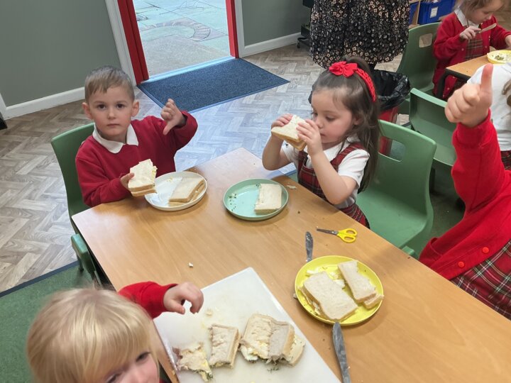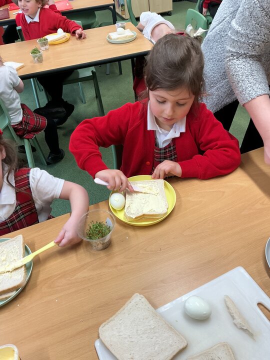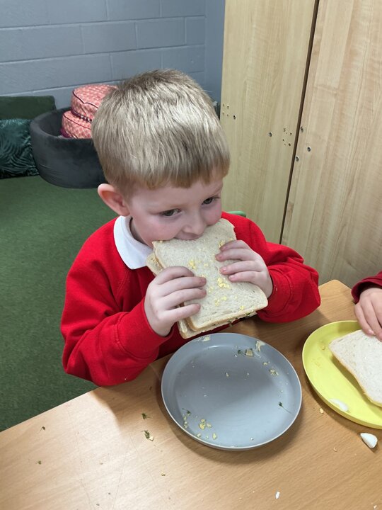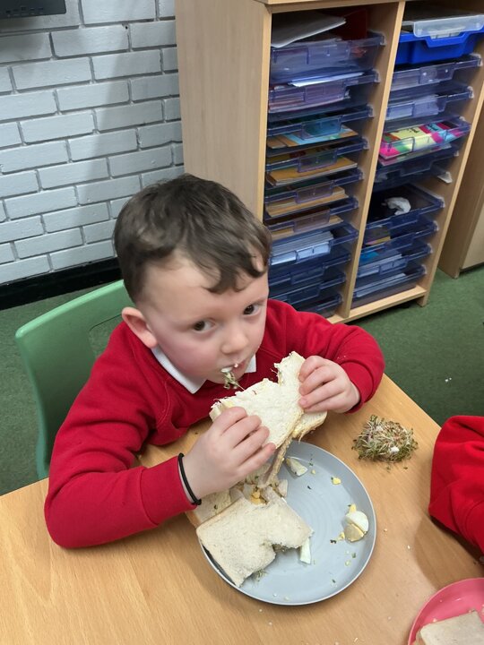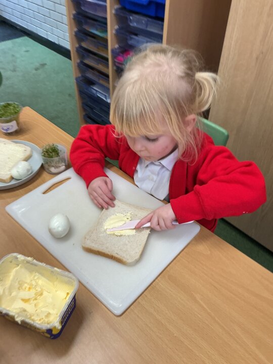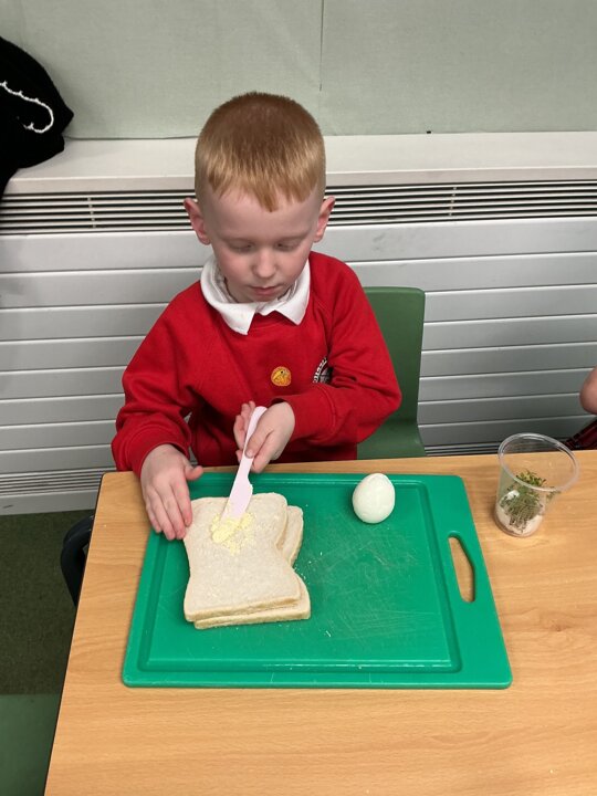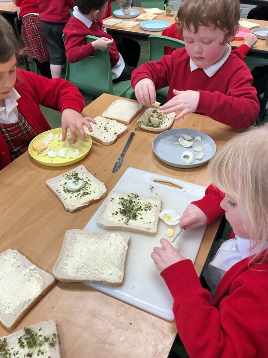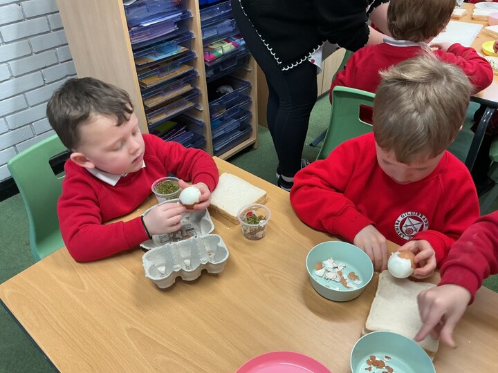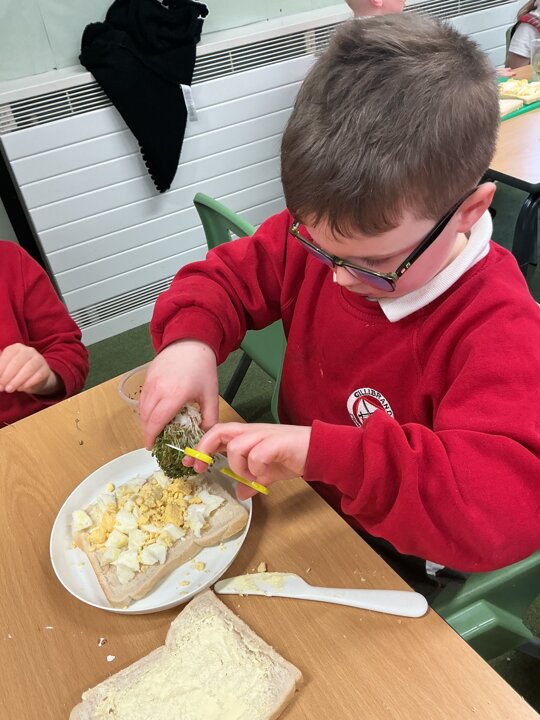 Reception class have been developing their fine motor skills through a fun and practical cooking activity. The children made their own egg and cress sandwiches using cress they had grown themselves in class.