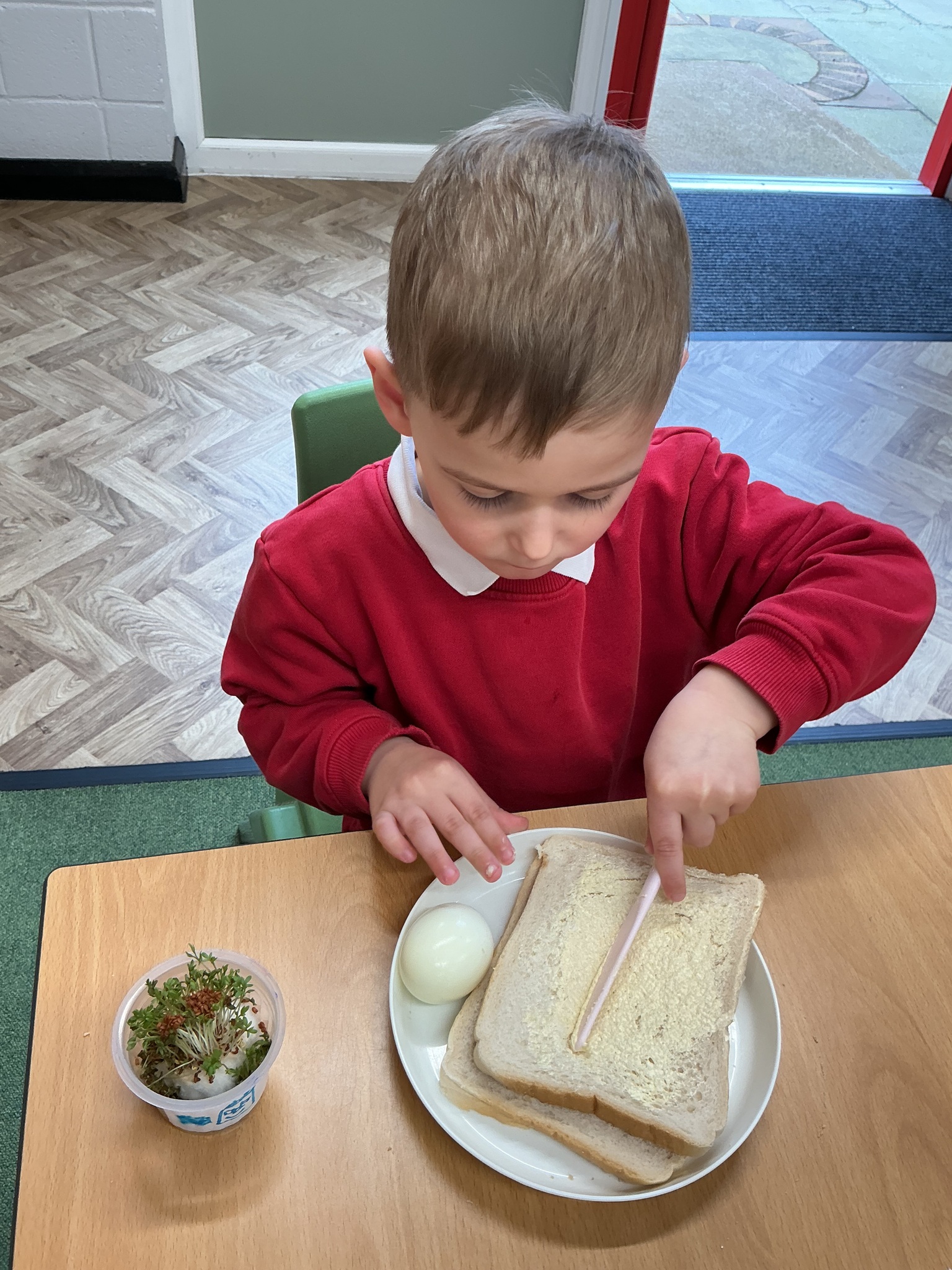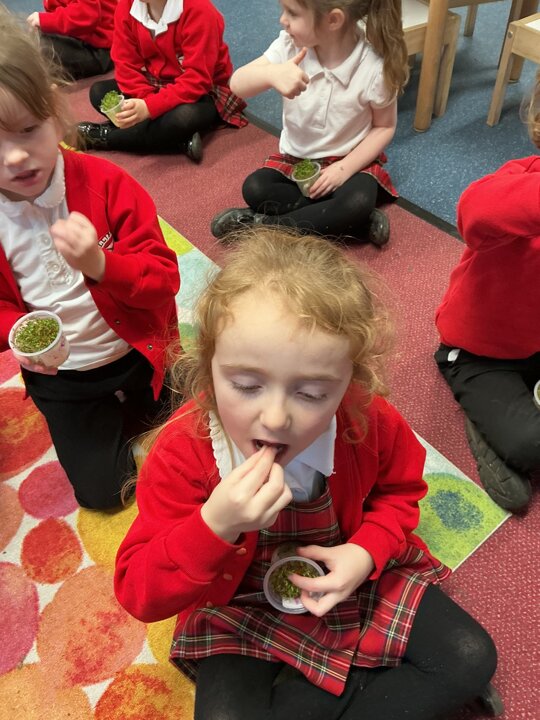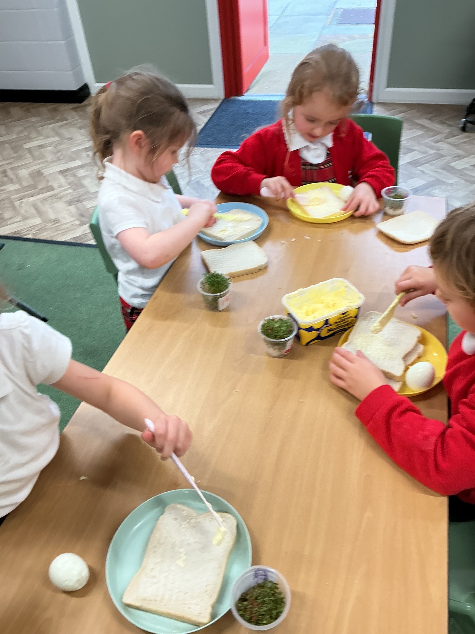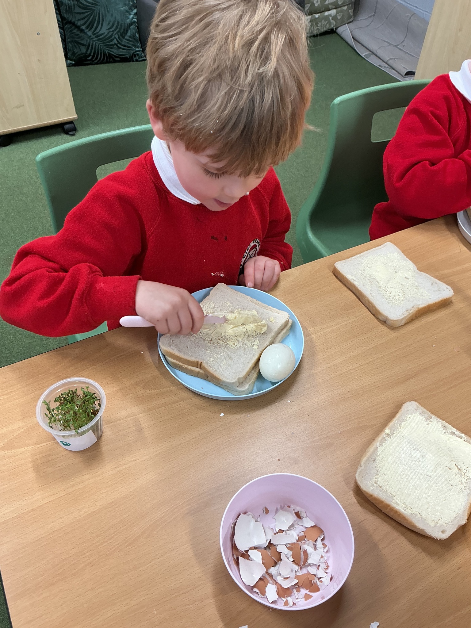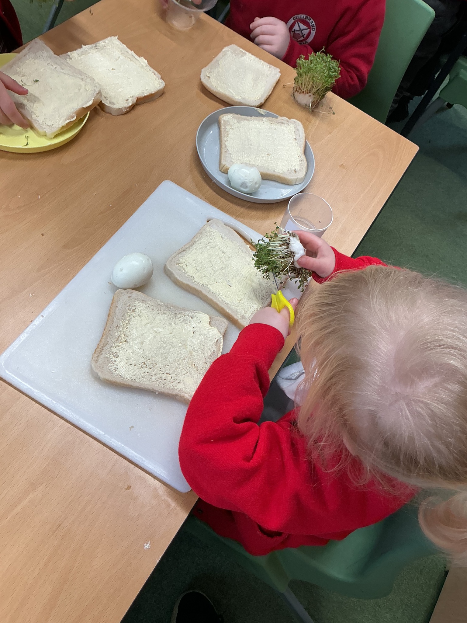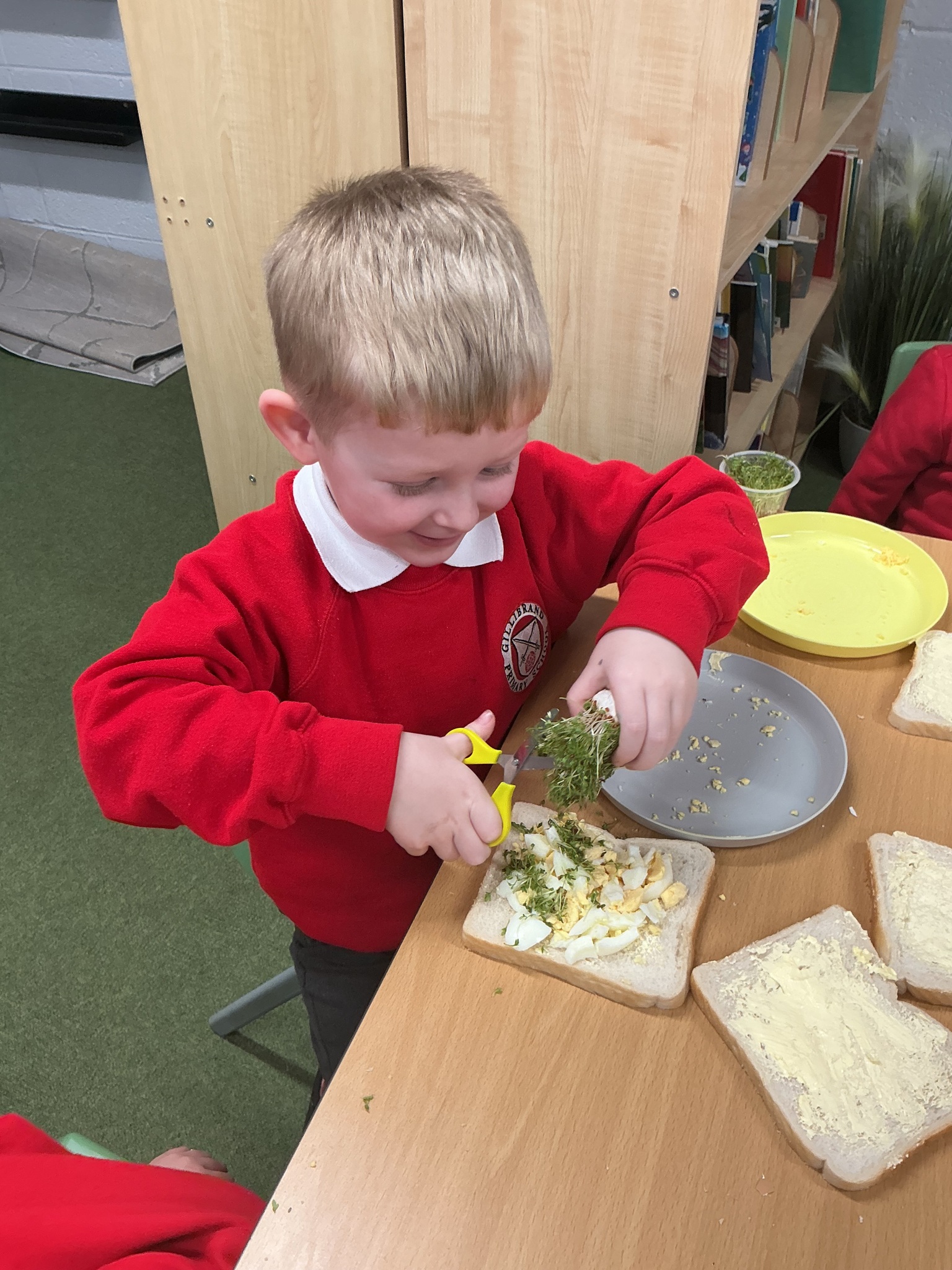 Reception class have been developing their fine motor skills through a fun and practical cooking activity. The children made their own egg and cress sandwiches using cress they had grown themselves in class.
