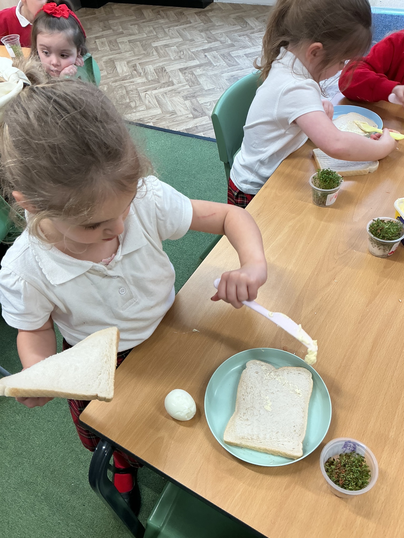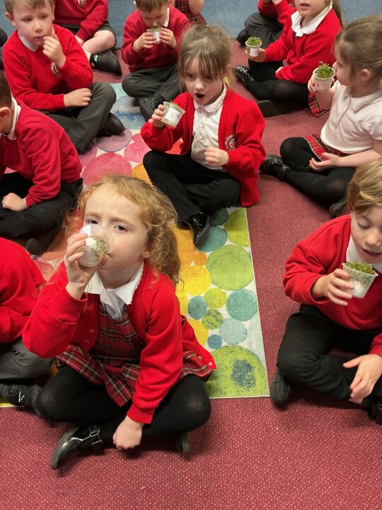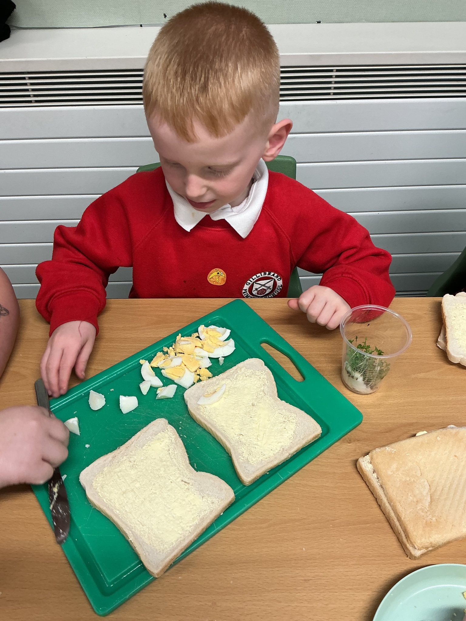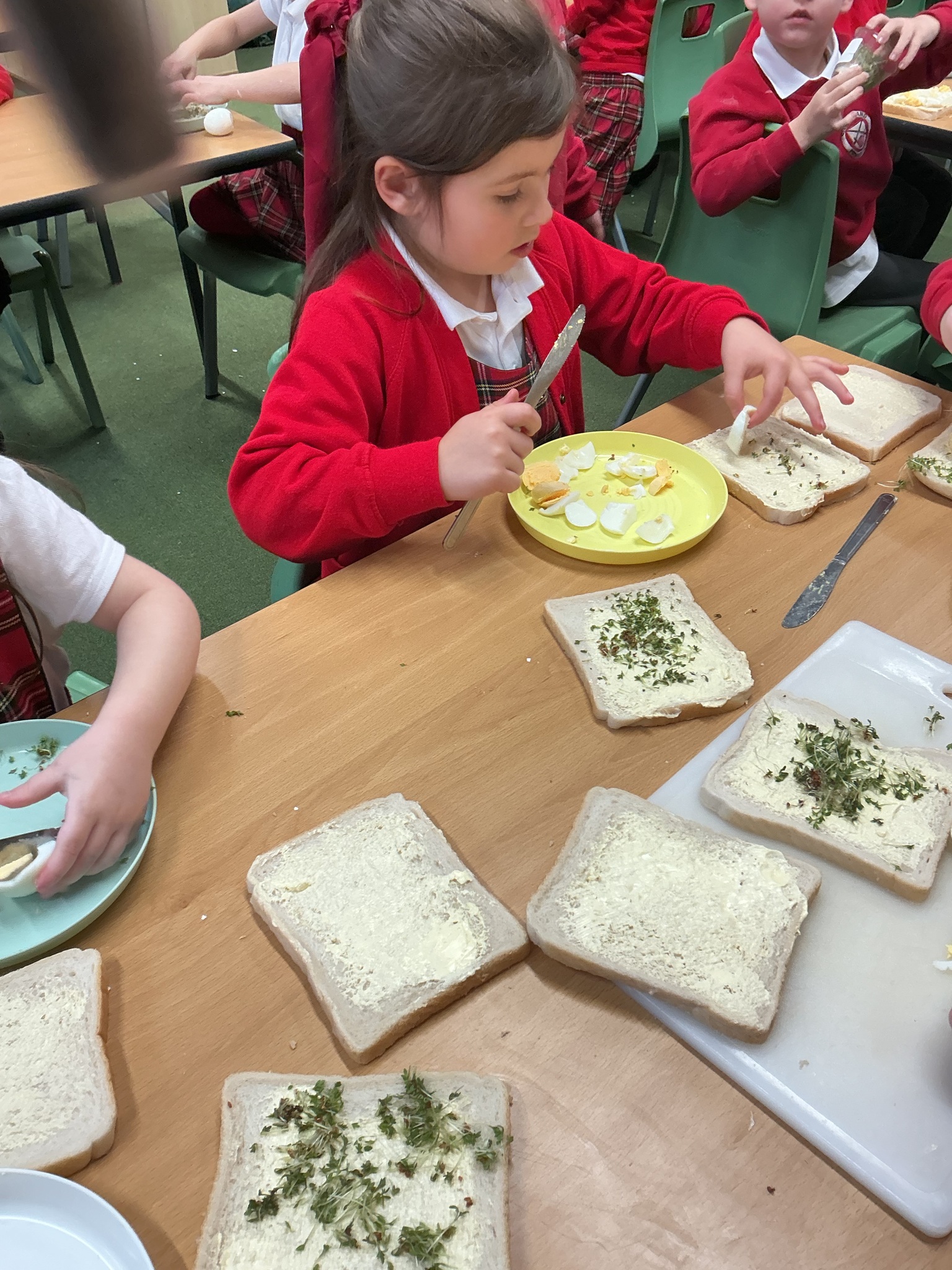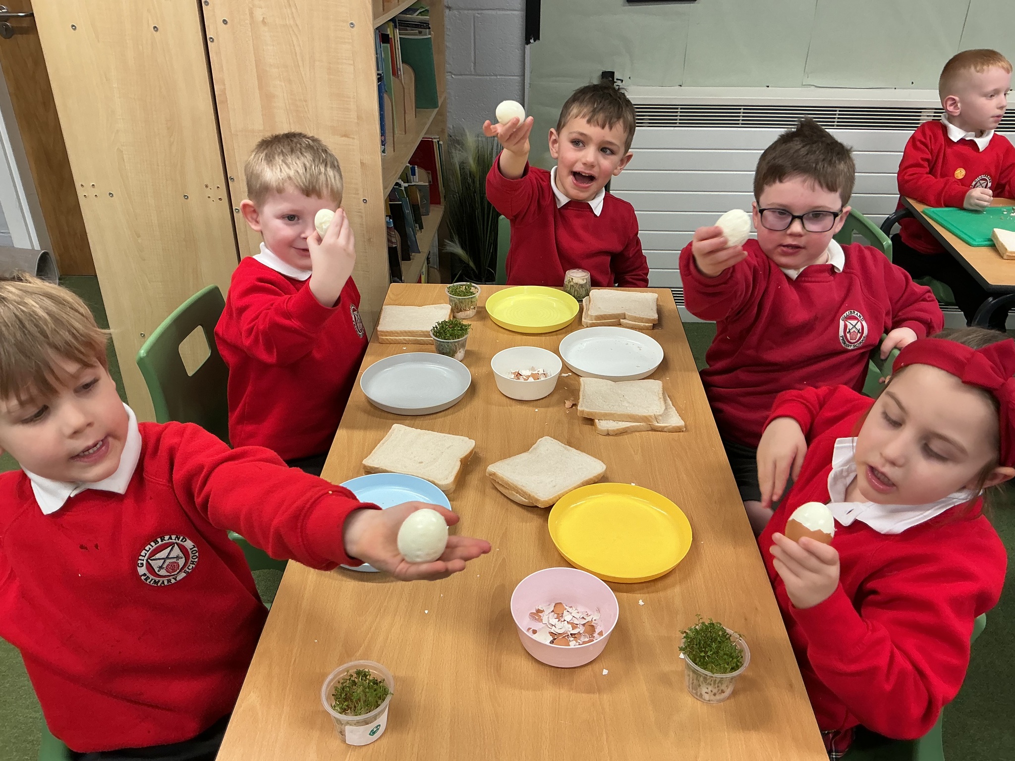 Reception class have been developing their fine motor skills through a fun and practical cooking activity. The children made their own egg and cress sandwiches using cress they had grown themselves in class.