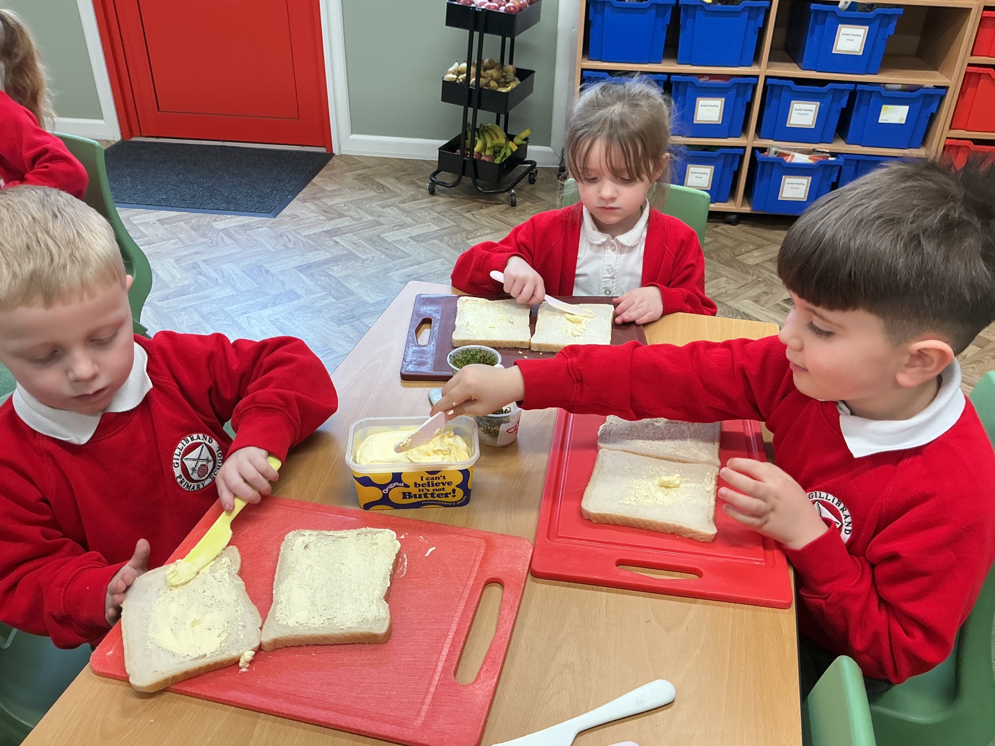 The activity gave the children lots of opportunities to practise important skills such as peeling, cutting, chopping and spreading butter. They worked carefully and safely, using their hands to strengthen finger muscles and improve control, while also following simple instructions.