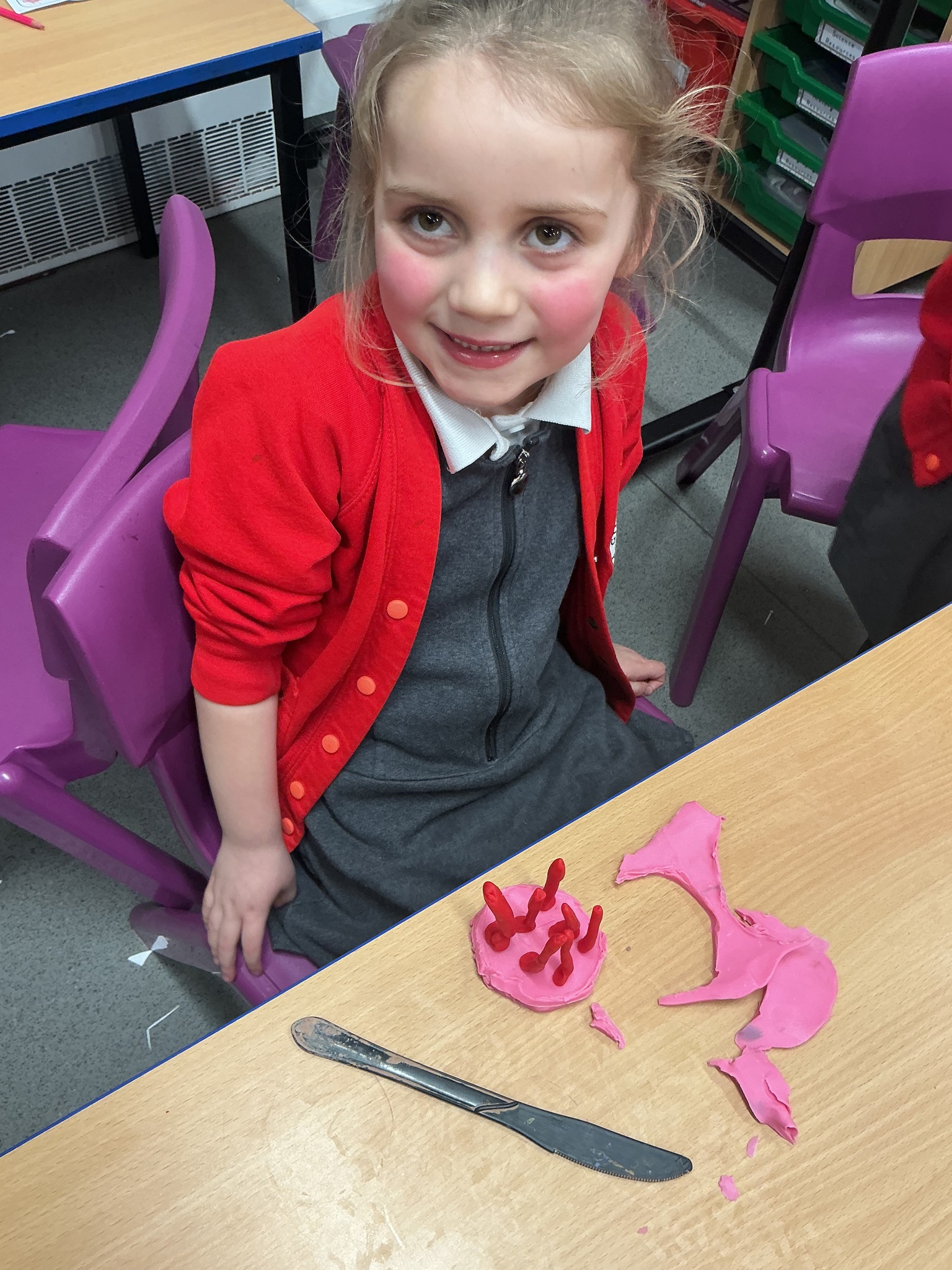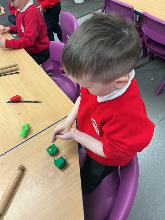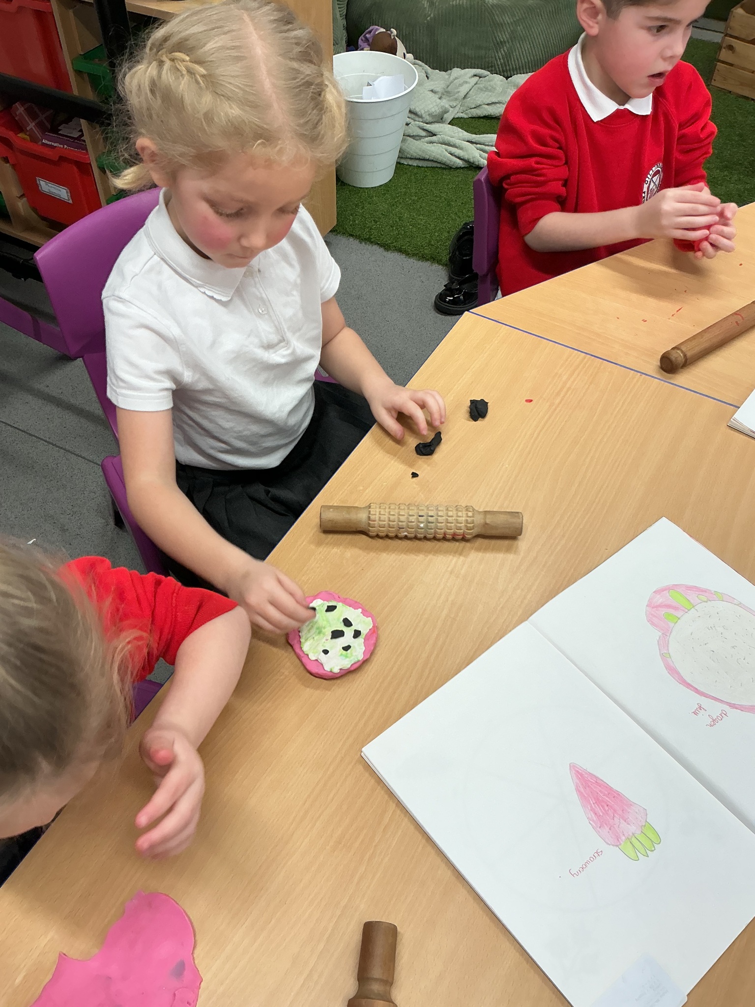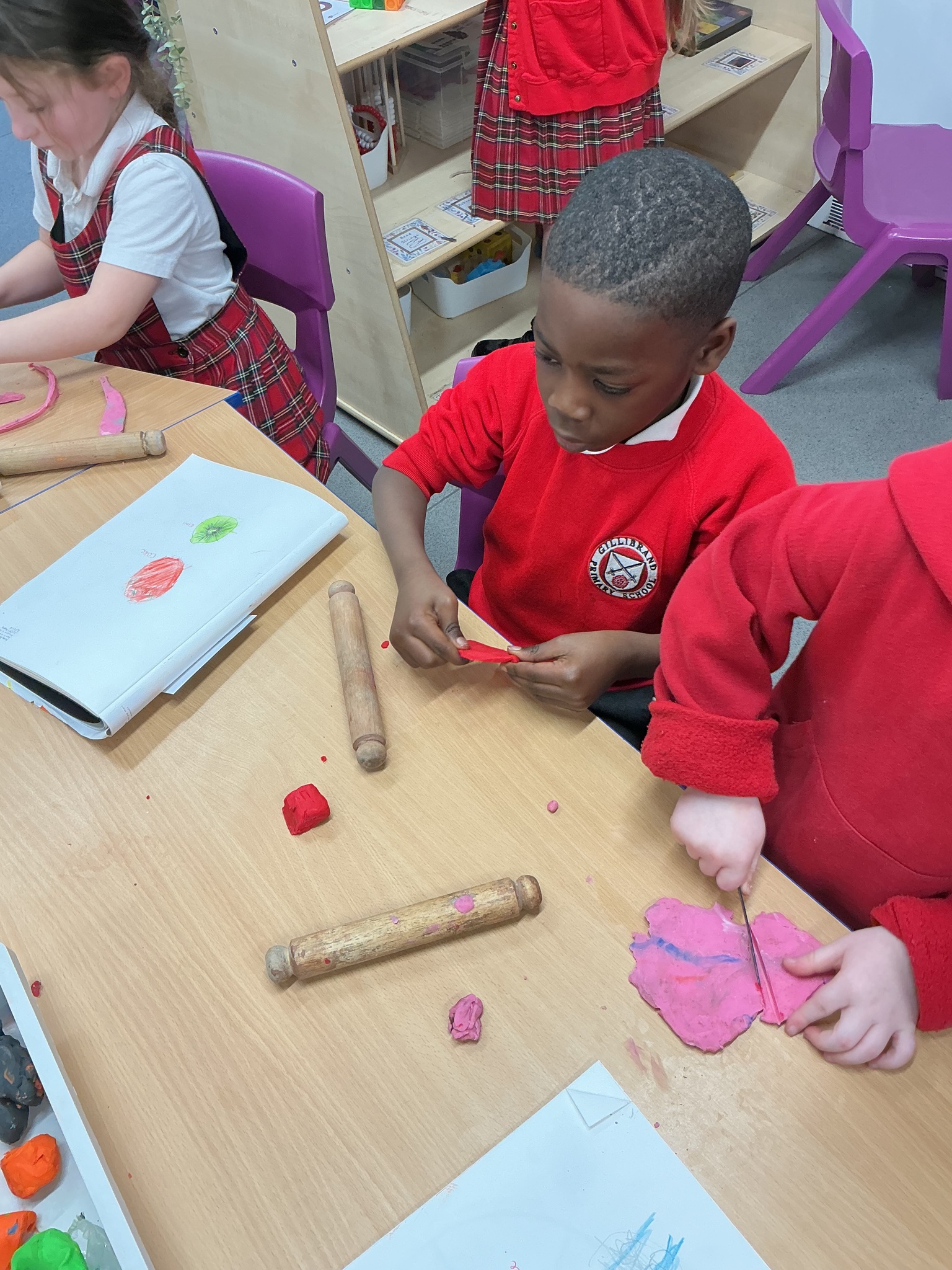 In art year 1 have been looking t sculpture. We looked at the artist Lucio Hierro who creates sculptures of food and the children created their own sculptures out of plasticine. They really enjoyed rolling and cutting the plasticine into different shapes to make their food sculptures.